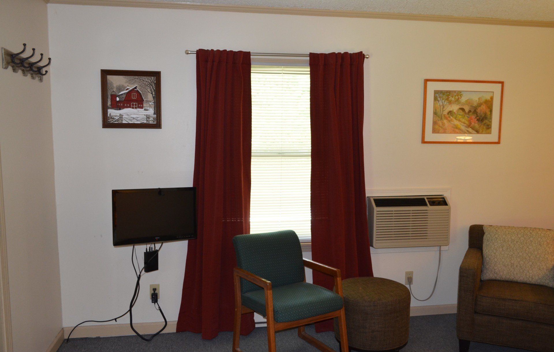 The Pine Lodge is attached to our restaurant, and each room has only a motel style entrance. In keeping with the name, each room has two walls covered with dimensional pine paneling. Each room includes a queen bed and private bath.