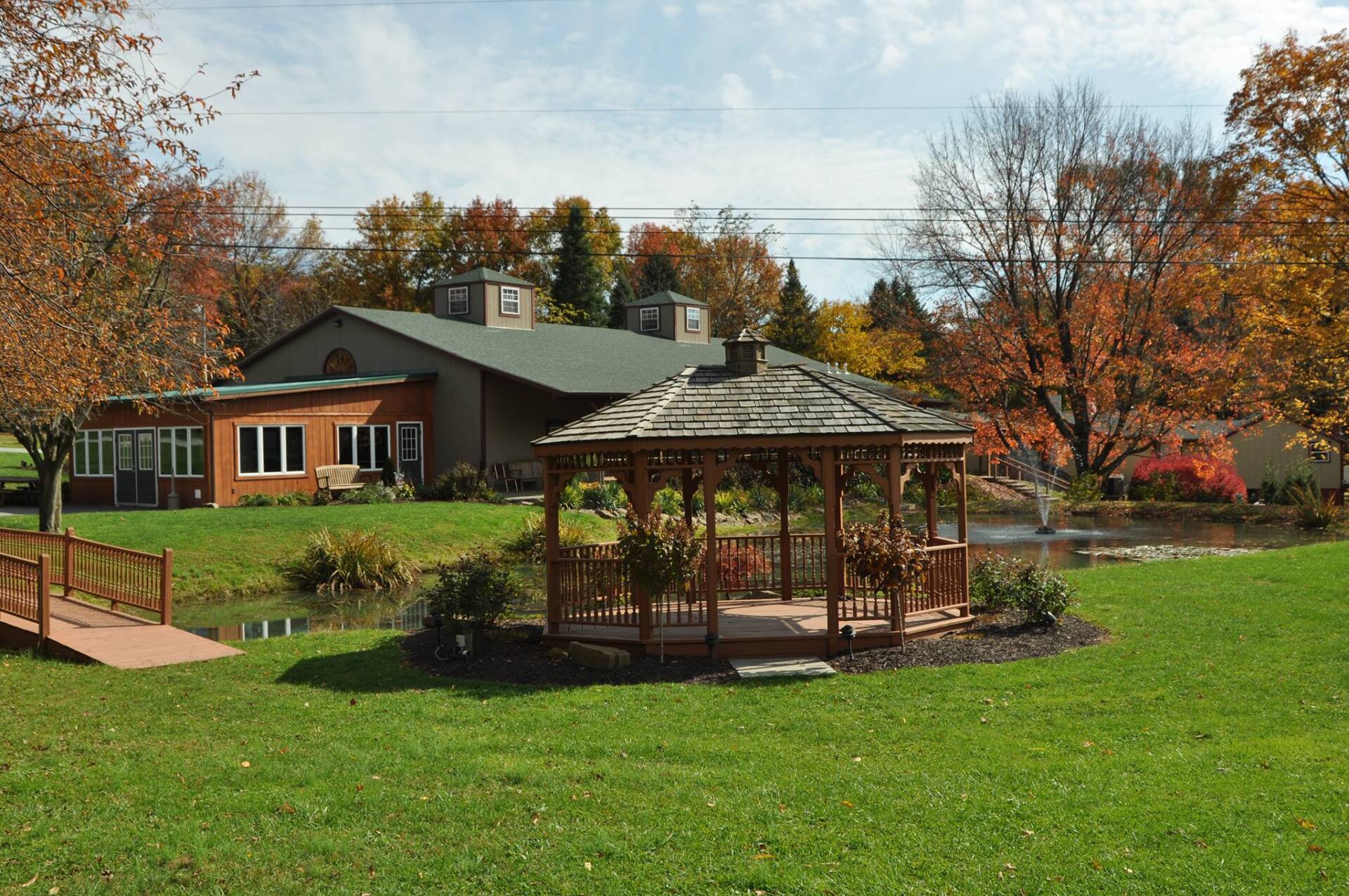 Nestled on forty acres in the heart of the Laurel Highlands, Foggy Mountain offers a beautiful scene for a woodland wedding. Say your 'I Do's' in the gazebo in front of our one acre pond, or have an intimate ceremony in the chapel. Outdoor summertime weddings are perfect in front of the stone hearth in the outdoor pavilion. Host your warm winter wedding at the Chapel with a wood burning fireplace in the background, or inside Walnut Hall with our gas fireplace.